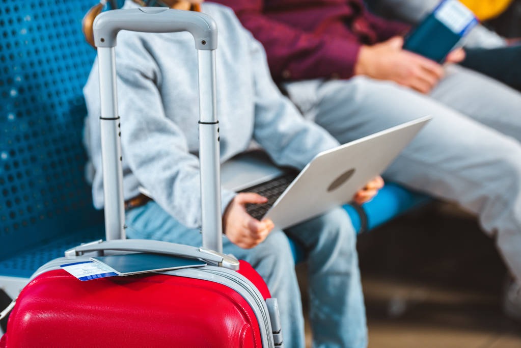 Alt: Cropped view of red luggage with a kid using laptop in background