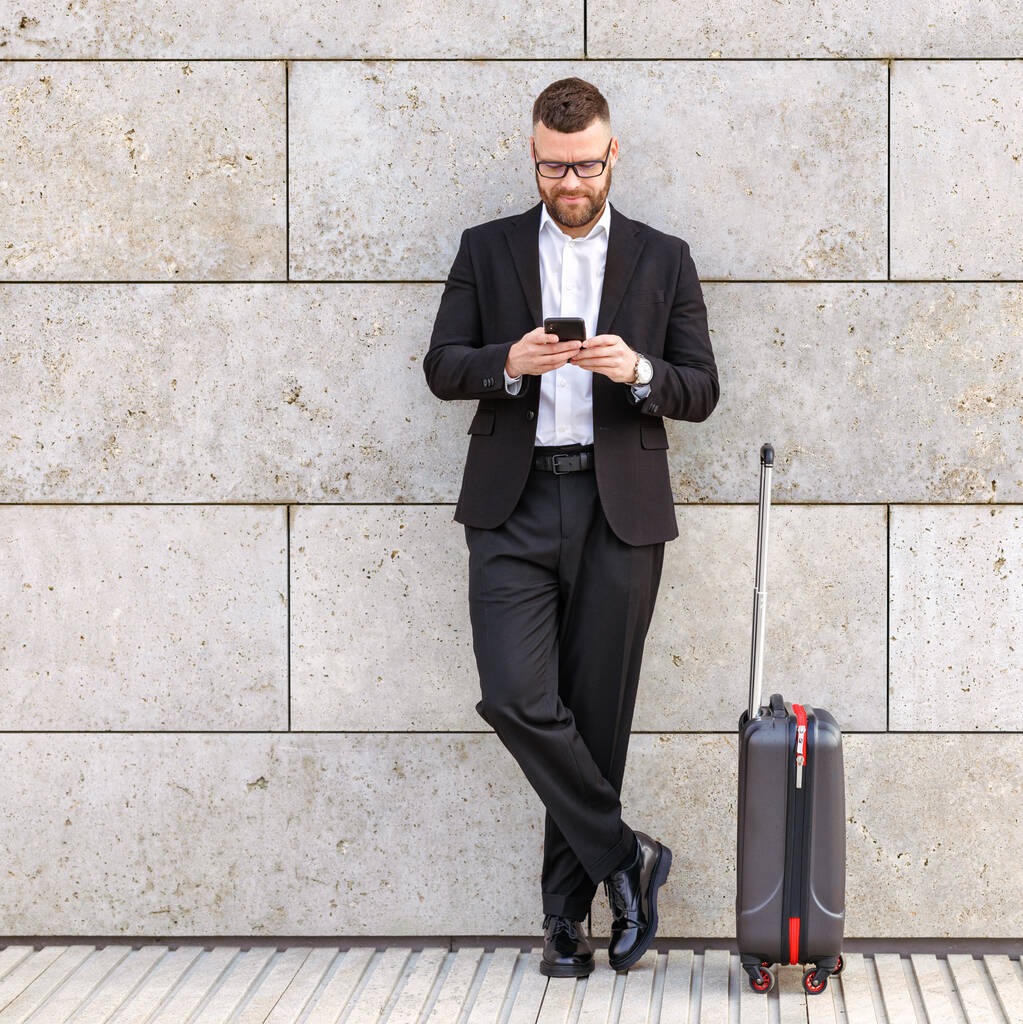 Alt: Person in formal outfit using smartphone while standing against concrete wall